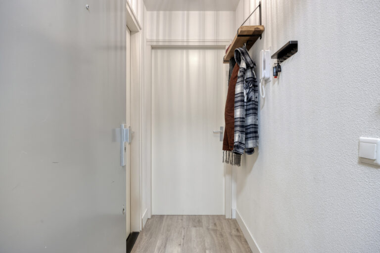 Via het portiek bereik je de centrale entree van het appartement. Vanuit de hal heb je toegang tot de badkamer en de leefruimte.