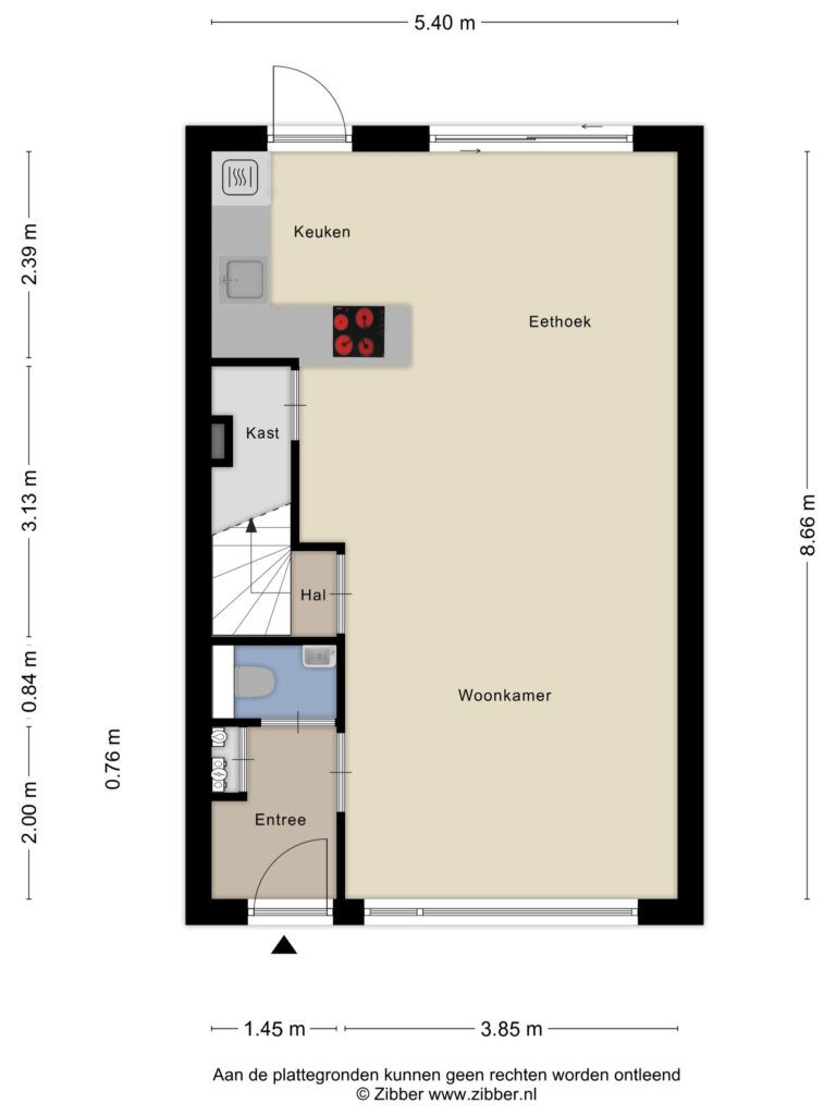 Via de voortuin bereik je de entree van de woning. Bij binnenkomst stap je in de hal, die toegang biedt tot de leefruimte, het toilet en de meterkast. Er is daarnaast voldoende ruimte voor een garderobe.